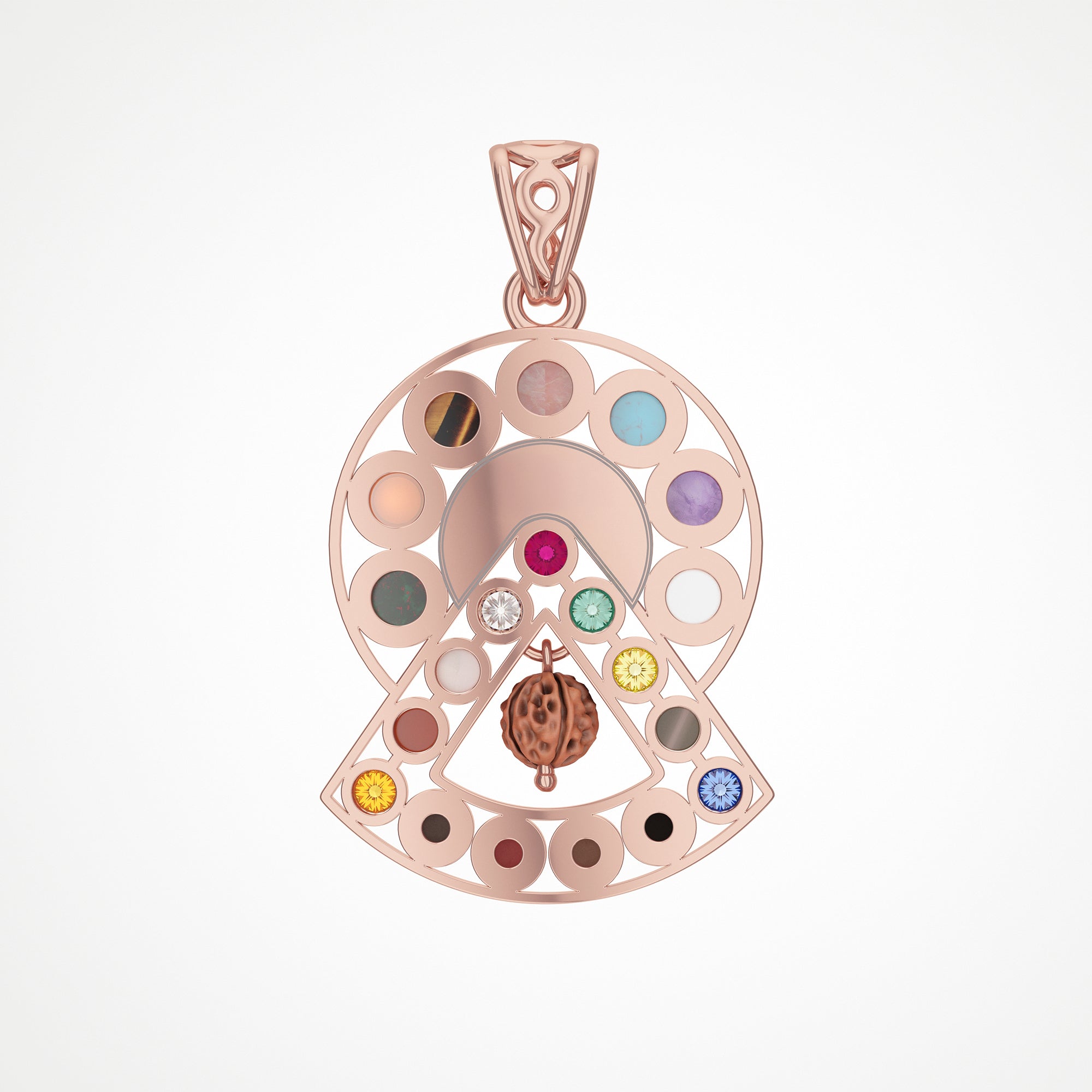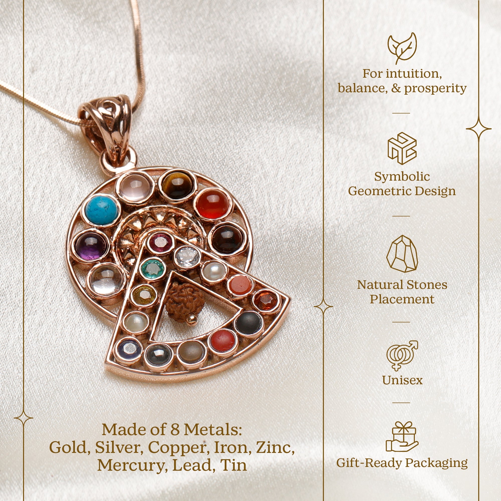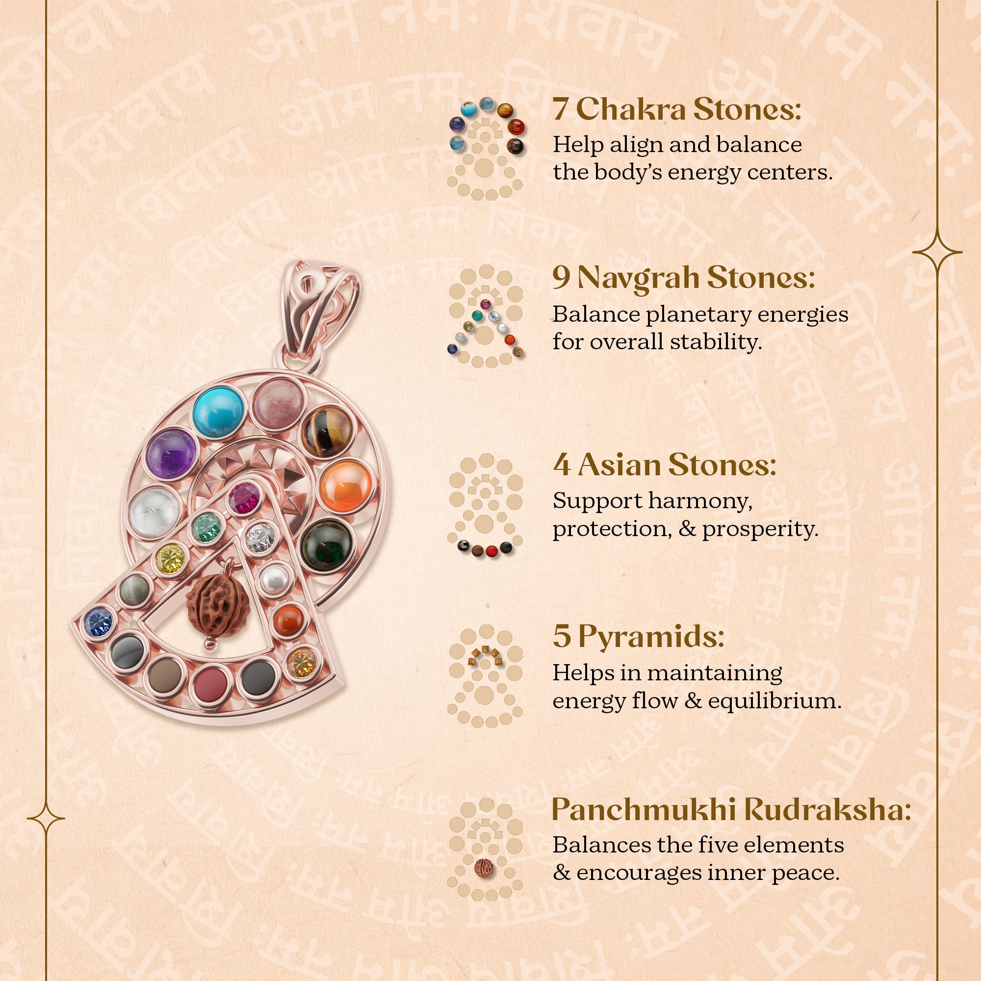 Infused with 9 Navgraha Stones, 7 Chakra Stones, Rudraksha, Pyramids, and Asian Stones, and forged in ashtadhaatu, this pendant embodies strength, vitality, and divine blessings. Ashtadhaatu is traditionally believed to enhance resilience, bring good fortune, and protect against misfortune.