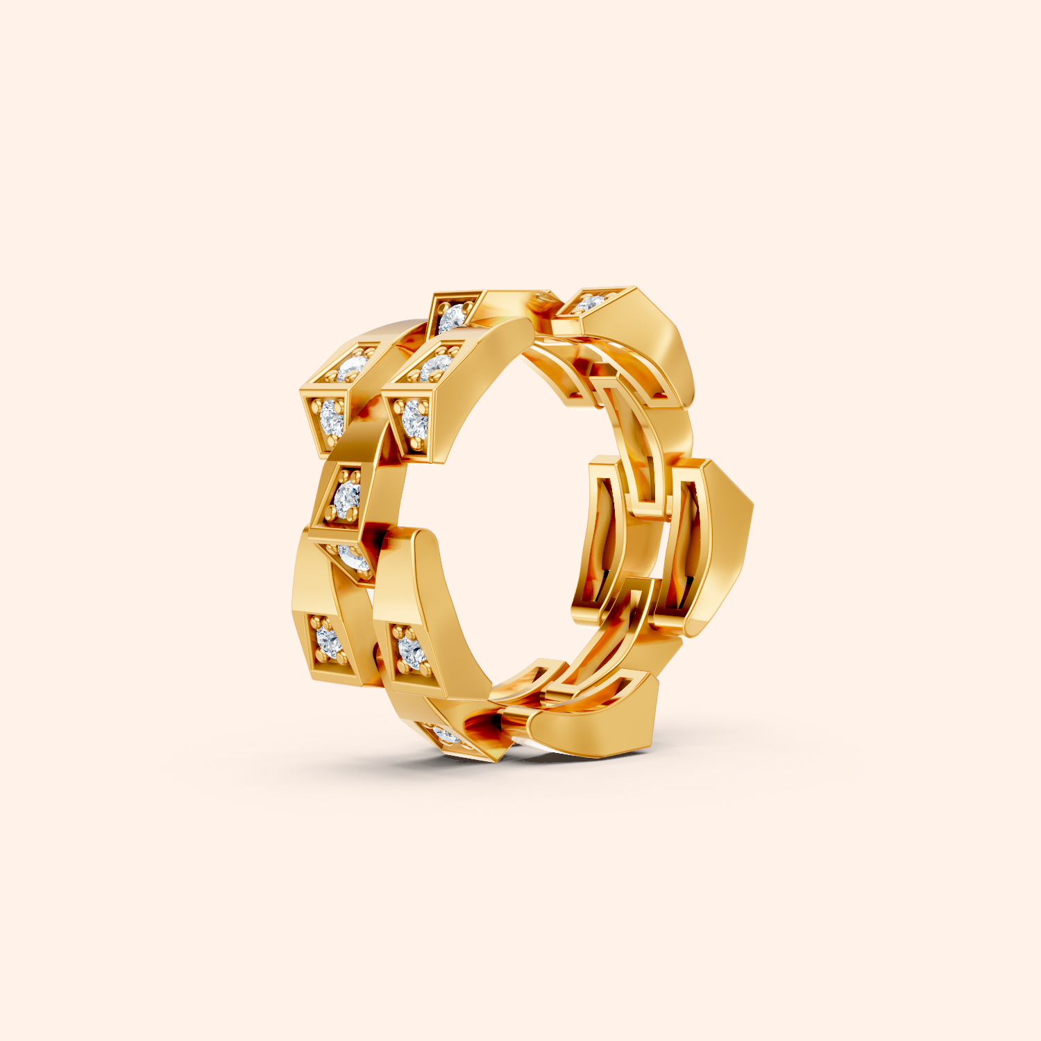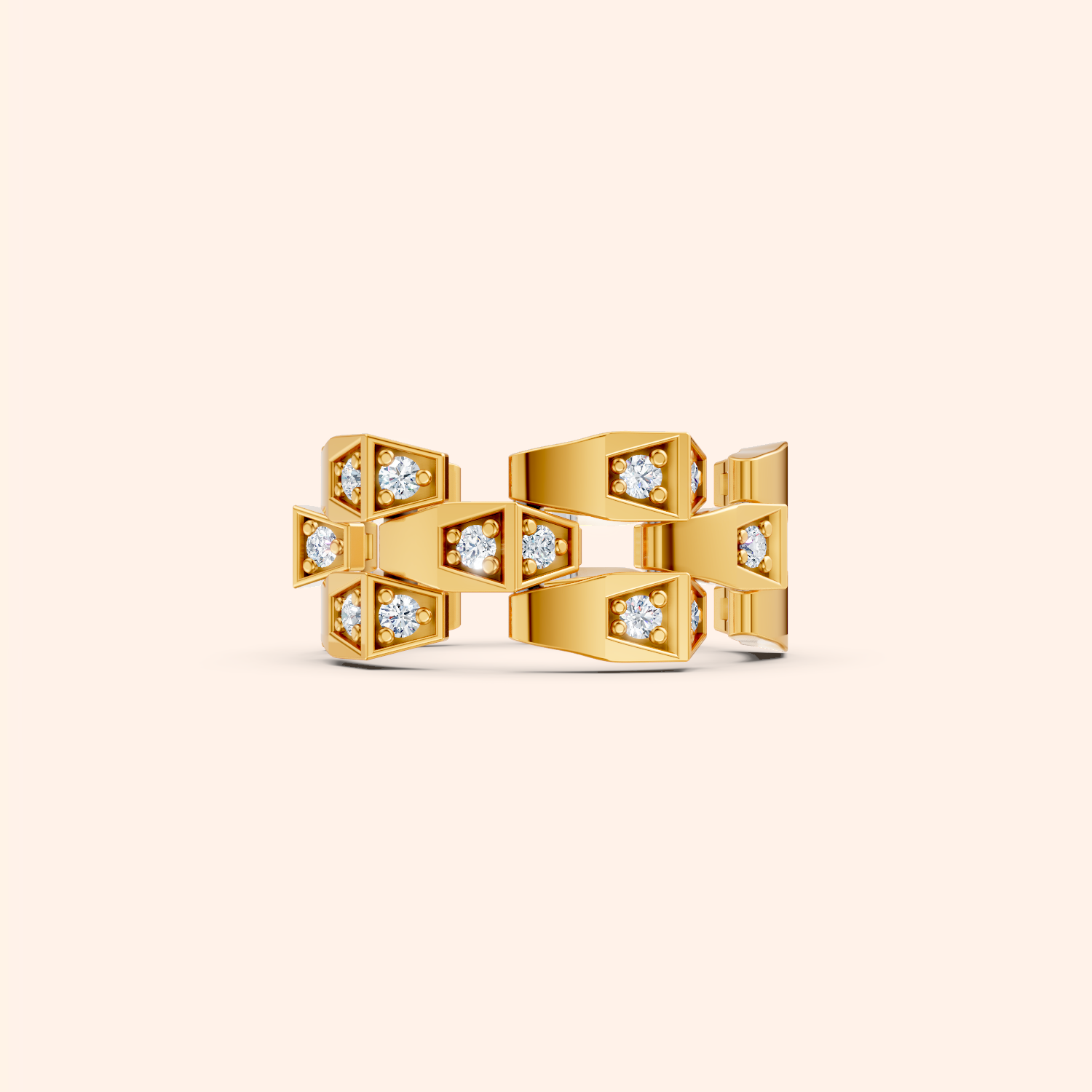 Make a bold statement with this Fortis Ring, featuring an edgy link design accented with sparkling diamonds. Crafted in solid gold, the ring combines modern architecture with timeless luxury. Perfect for those who love statement jewellery, this unisex gold ring is ideal for parties, power dressing, or gifting. The mix of sharp angles and brilliant stones creates a unique look that stands out—an icon of strength, confidence, and style.